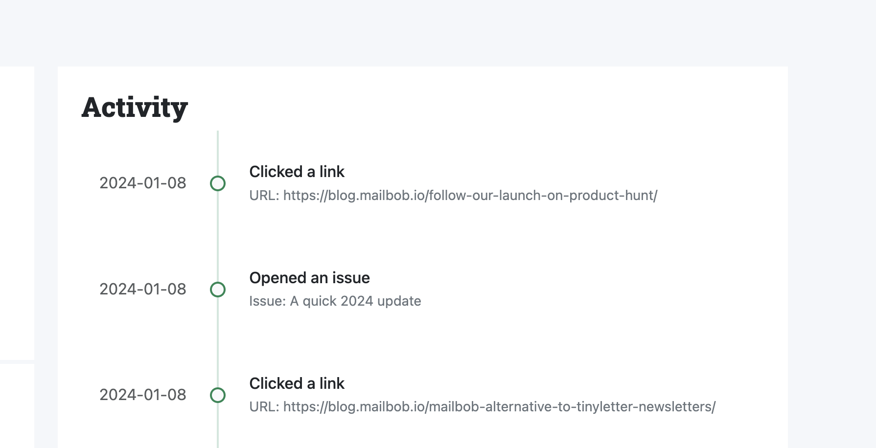 In tandem with segmentation, we’re thrilled to unveil our new activity feeds for subscribers. This feature, available in the Subscribers section of the dashboard, empowers Mailbob users to gain deeper insights into their audience. Currently, the activity feeds track email opens and clicks, providing valuable engagement metrics. But stay tuned – we have plans to expand this feature to include a broader range of events, giving you an even more comprehensive view of subscriber interactions.